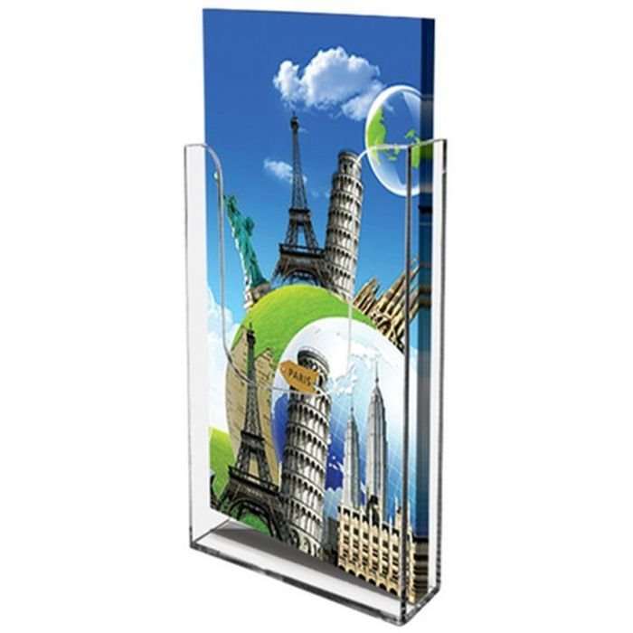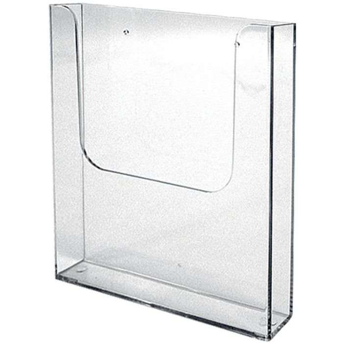 Broschyrhållare tillverkad i transparent formsprutad akryl. För vägghängning.