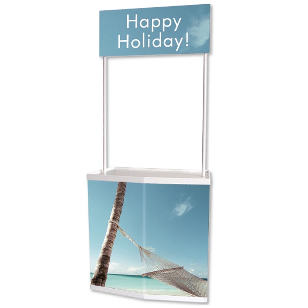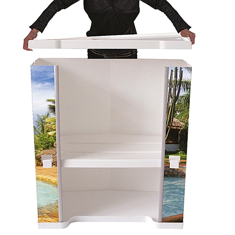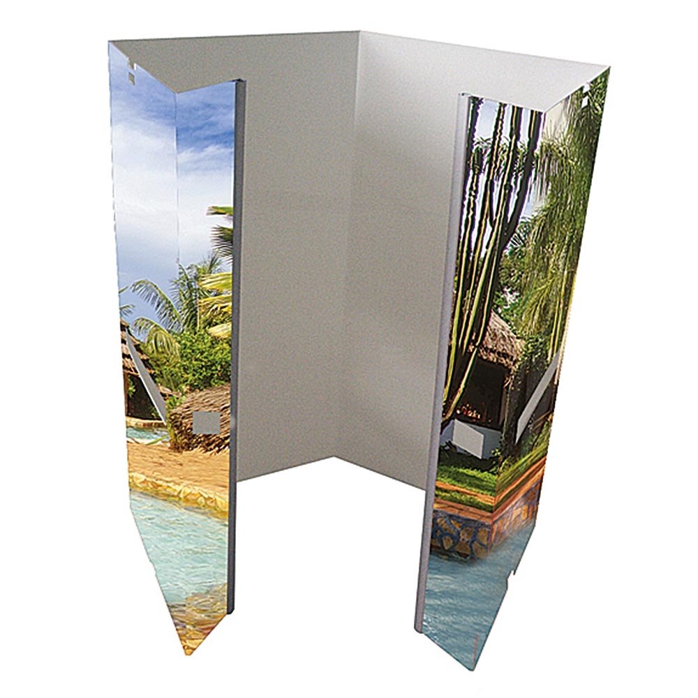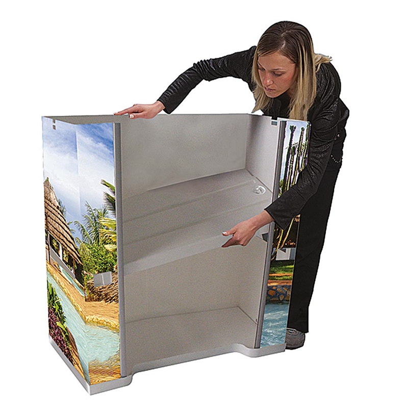 Kompakt infobord med hylla och väska. För användning på mässor - som demobord eller för andra presentationer. Tillverkad av vit polystyren. Hopfällbar och lätt att transportera.