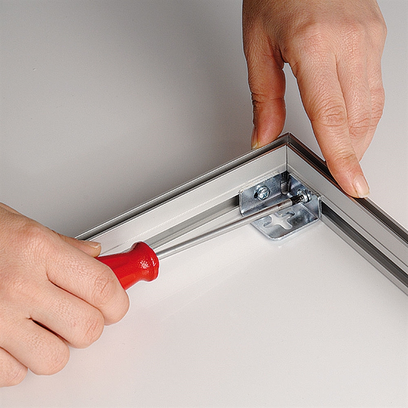 Enkelsidig ram med anodiserad aluminiumprofil - 32 mm djup - för väggmontage. Banderollen sys fast på en nylonremsa och monteras i ramen. Levereras omonterad (utan nylonremsor och banderoll). Rekommenderas för inomhusbruk.