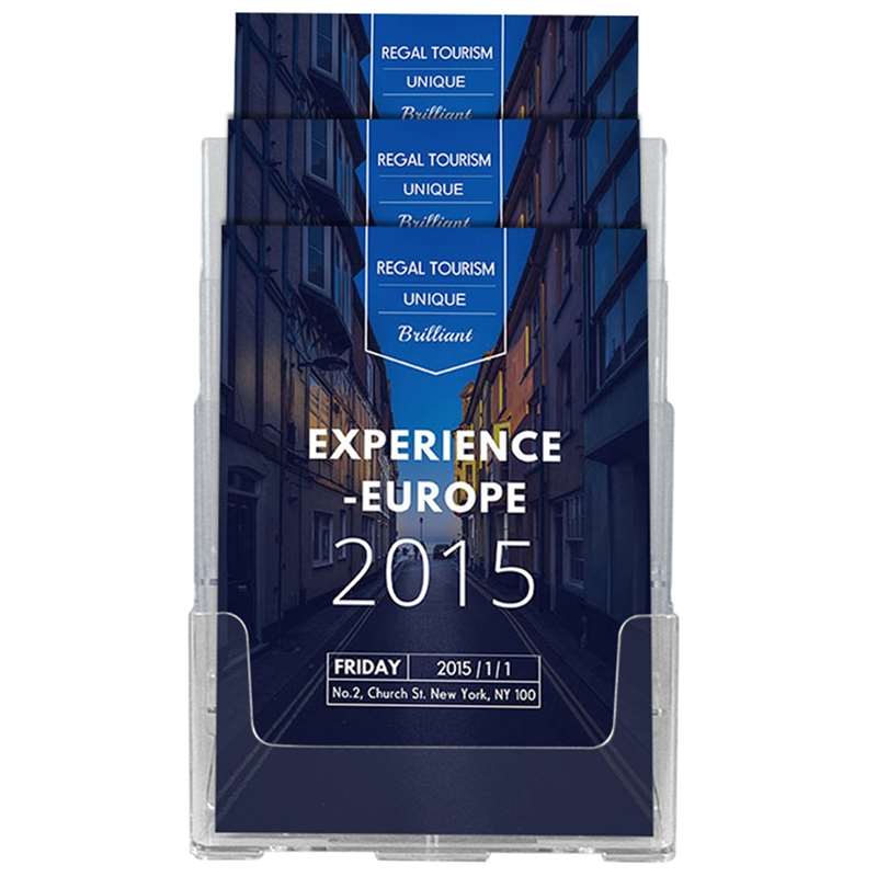 • Flexibel displaylösning - denna broschyrhållare kan enkelt monteras på en vägg eller ställas på en bord eller disk.