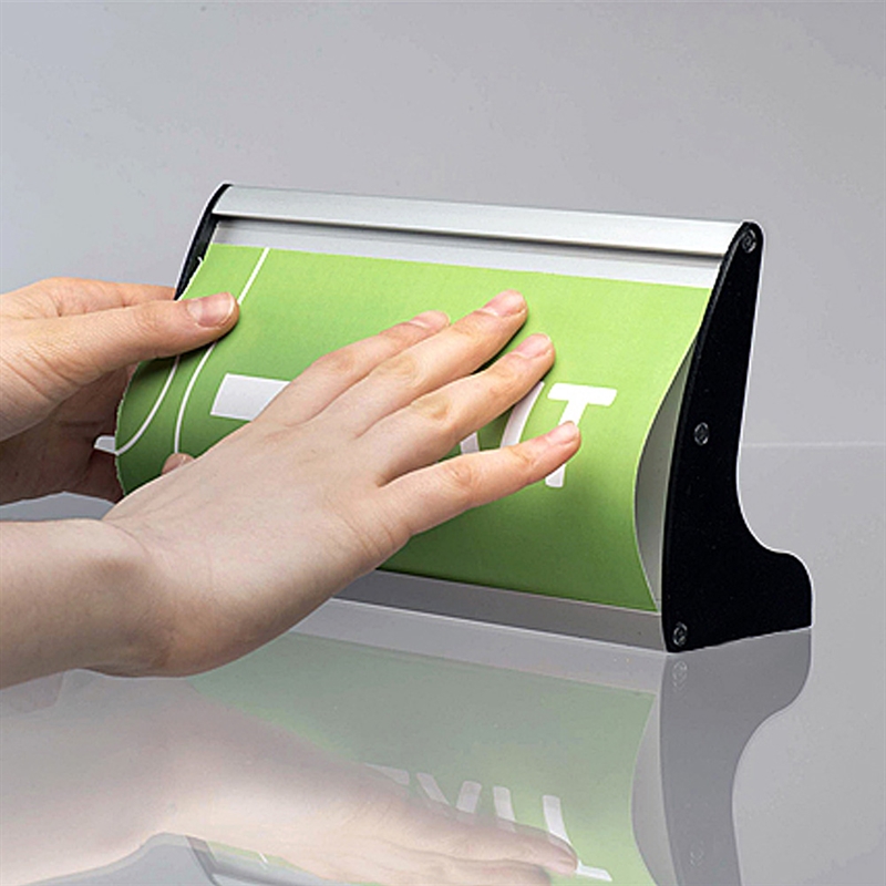 Elegant aluminiumprofil med möjlighet att montera ett tryck, eller lägga in papper, bakom den medföljande APET frontplast . Sidostöd av svart plast.