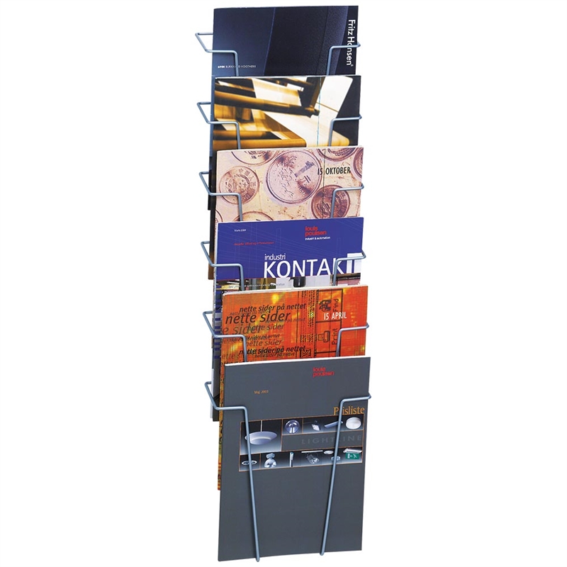Designad för att rymma sex A4-broschyrer. Tillverkad av robust stål och kommer i en klassisk silverfärg som passar in i alla inredningar.