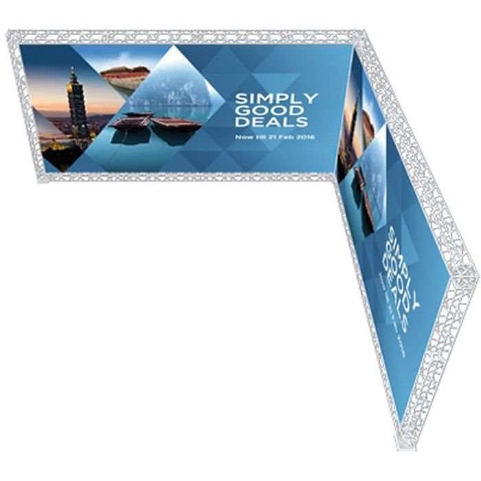 Crown Truss 15 L-form väger 69 kg och har dimensioner på 490 x 246 x 490 cm. Banderollens storlek bör vara 2 stycken i storleken 455 x 212 cm. Standardfärgen är vit och passar bra i alla scenarier. Idealisk för mässutställningar och större evenemang inom kategorin mässutrustning.