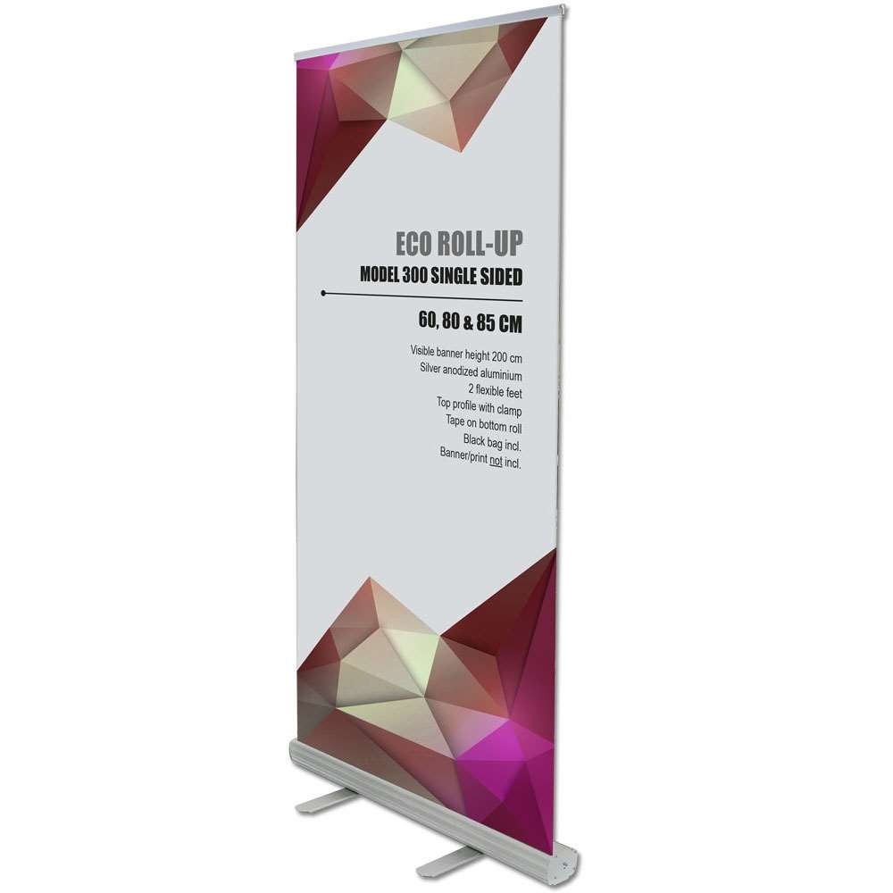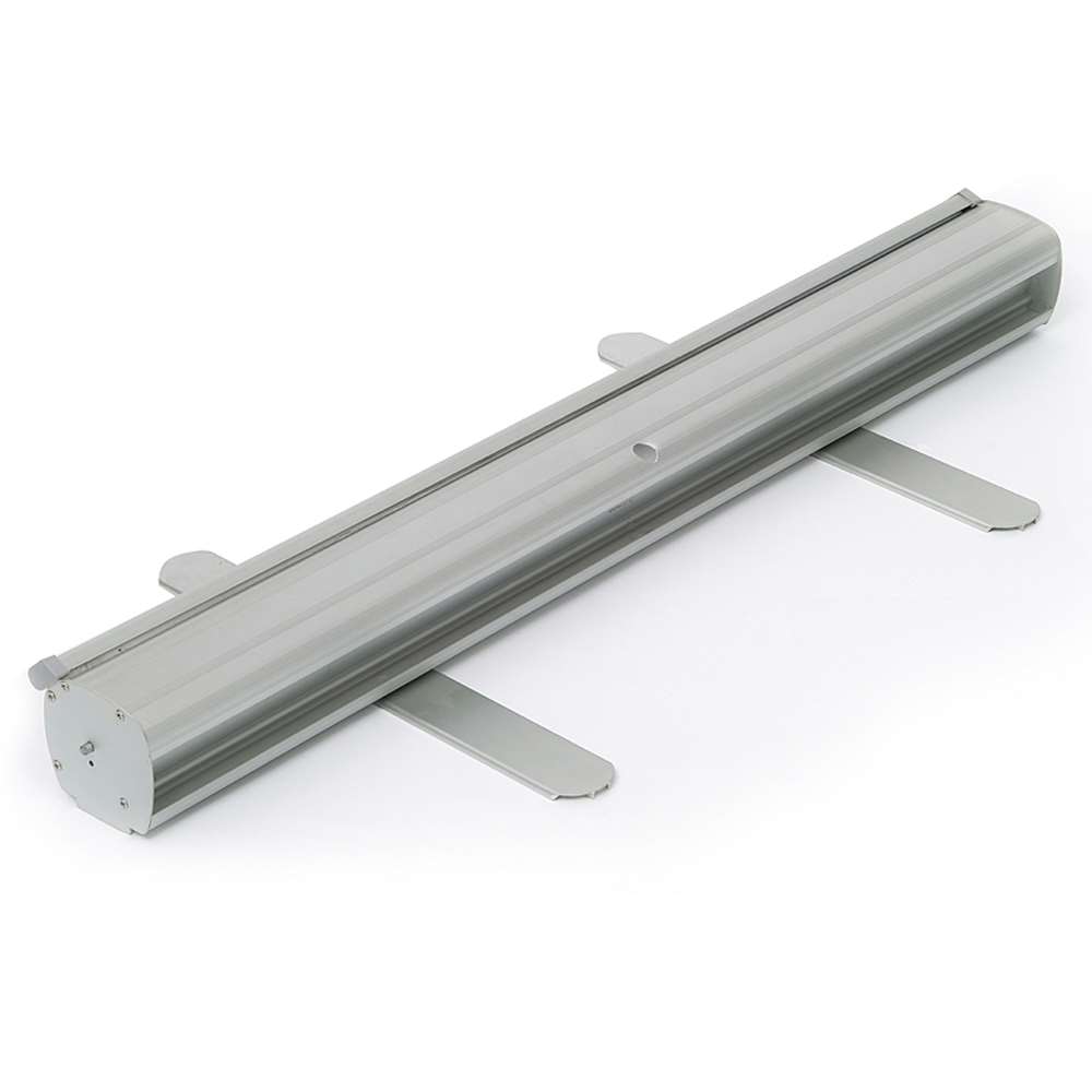 Letvægts roll-up i stilrent design. Kassetten er fremstillet af lidt tyndere aluminium end Budget og Basic versionerne. Topprofil med klemliste, samt tape på plast bundrulle gør det let at montere banneret. Ved udskiftning af budskab skal ny tape monteres.