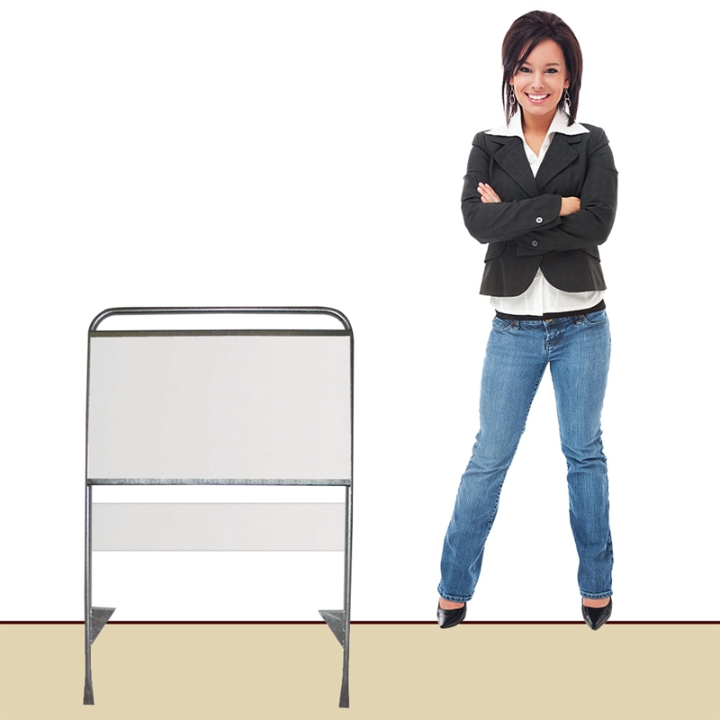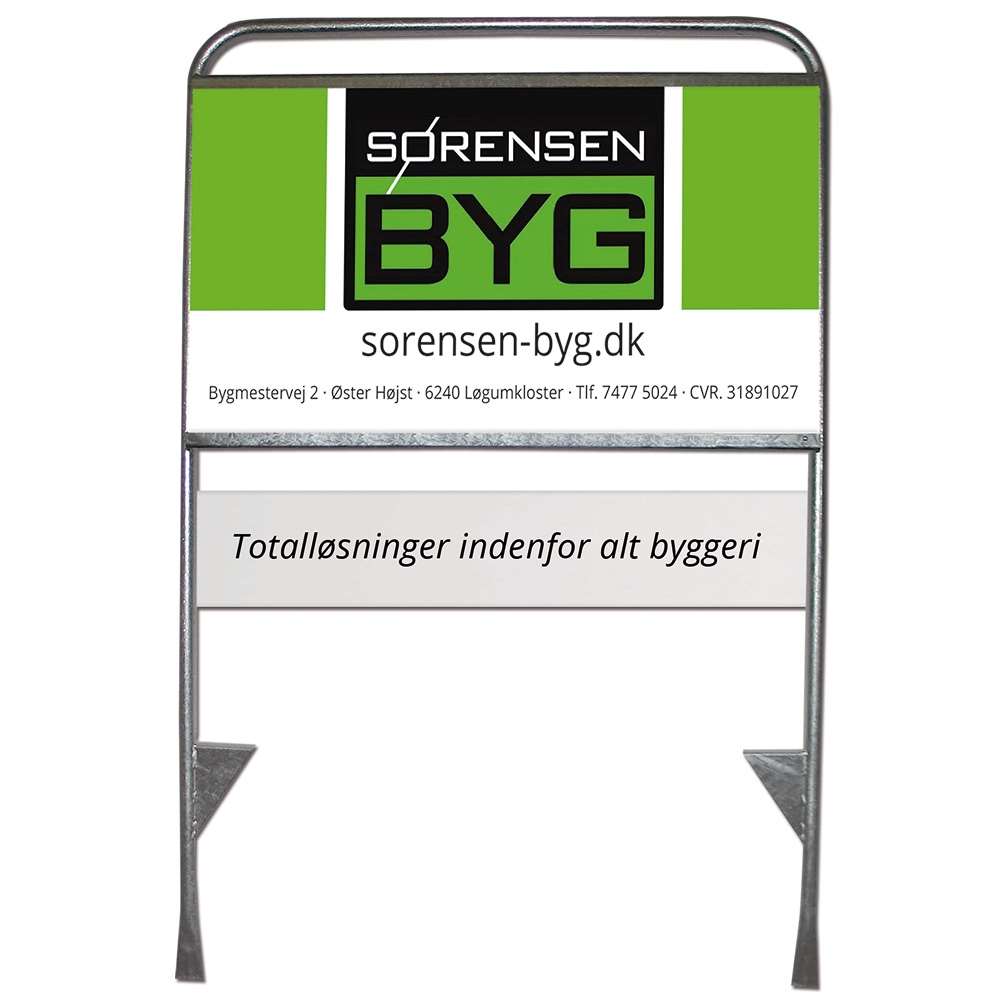 Tillverkad i galvaniserat 22 mm stålrör. Tillverkad med skenor för att sätta in plattan. Skylten kan stickas 30 cm ner i marken.