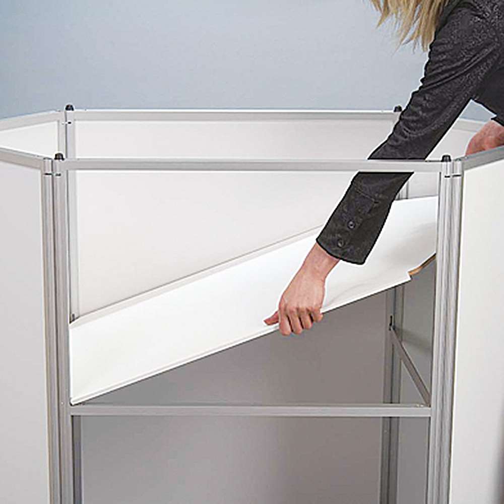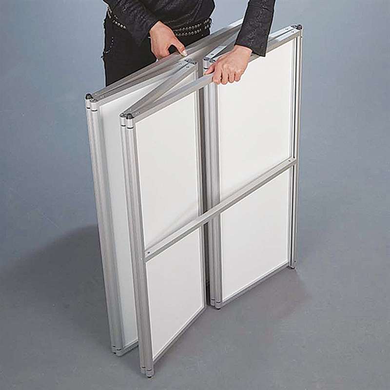 Messdisk gjord av silveranodiserade aluminiumramar med hylla och fem vita 3 mm PS-plattor (exkl. tryck). Panelerna är lätta att byta ut. Väska köps som tillbehör.