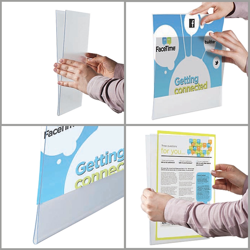 Detta Window U-pocket är en kraftig, dubbelsidig horisontell plastficka i A4-storlek, tillverkad i anti-reflektivt APET. Dess design möjliggör snabb utbyte av meddelanden, vilket gör den mycket praktisk att använda i alla sammanhang.