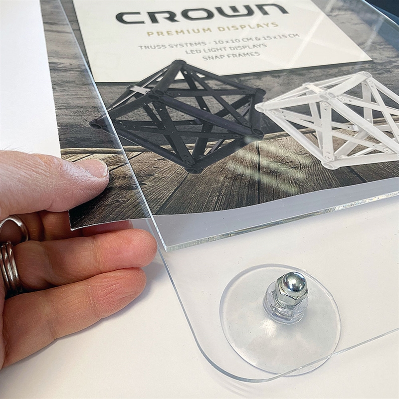 Ramen är tillverkad av 3 mm klar akryl och designad för dubbelvisning av meddelanden. Perfekt för att visa annonser, erbjudanden eller meddelanden på båda sidor. Den har fyra kraftiga sugkoppar som håller ramen säkert på fönstret, så att ditt meddelande visas tydligt och stabilt.