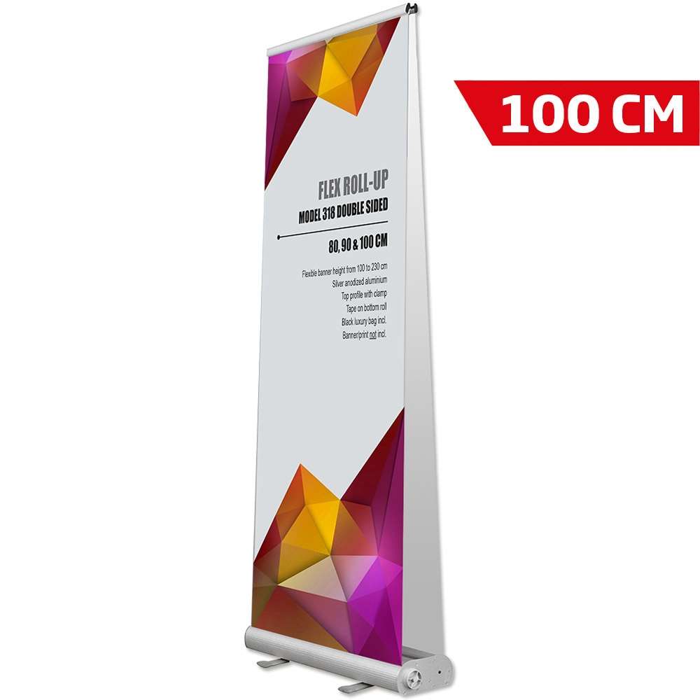 • Dobbeltsidig roll-up kassett utan banderoll: Denna utställningsställ har plats för två banderoller på varje sida - tillgänglig i en bredd på 100 cm.