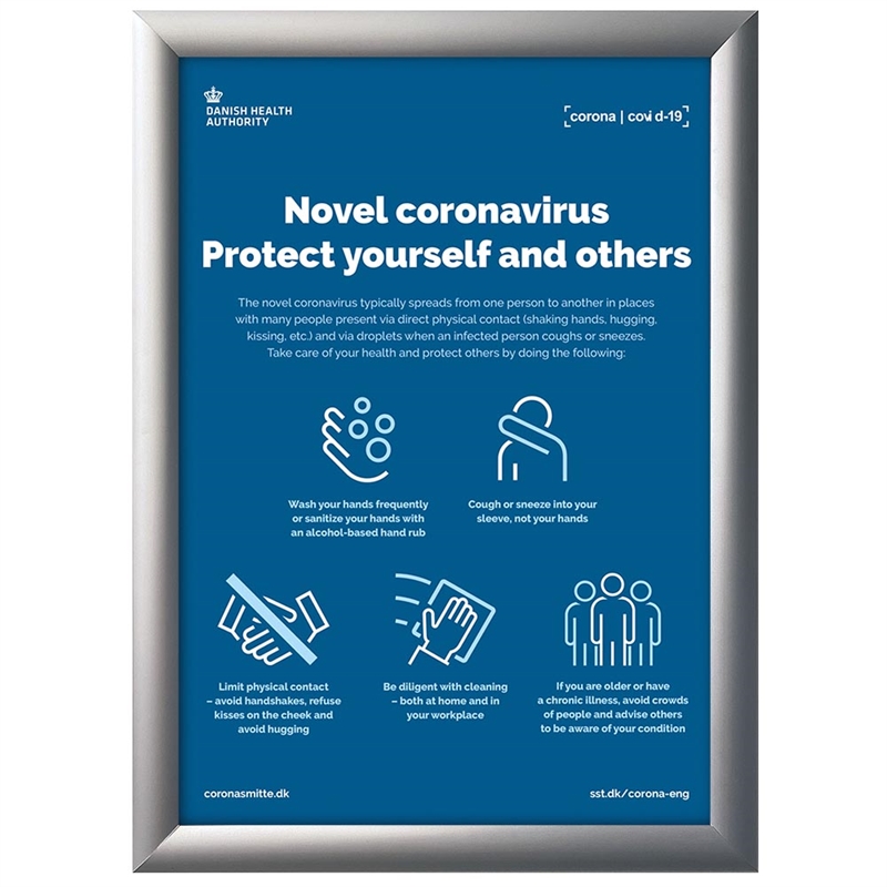 25 mm vikbar aluminiumram för A4- eller A3-affisch och en 1000 ml dispenser med sensor för handsprit (batterier ingår ej). För väggmontage.