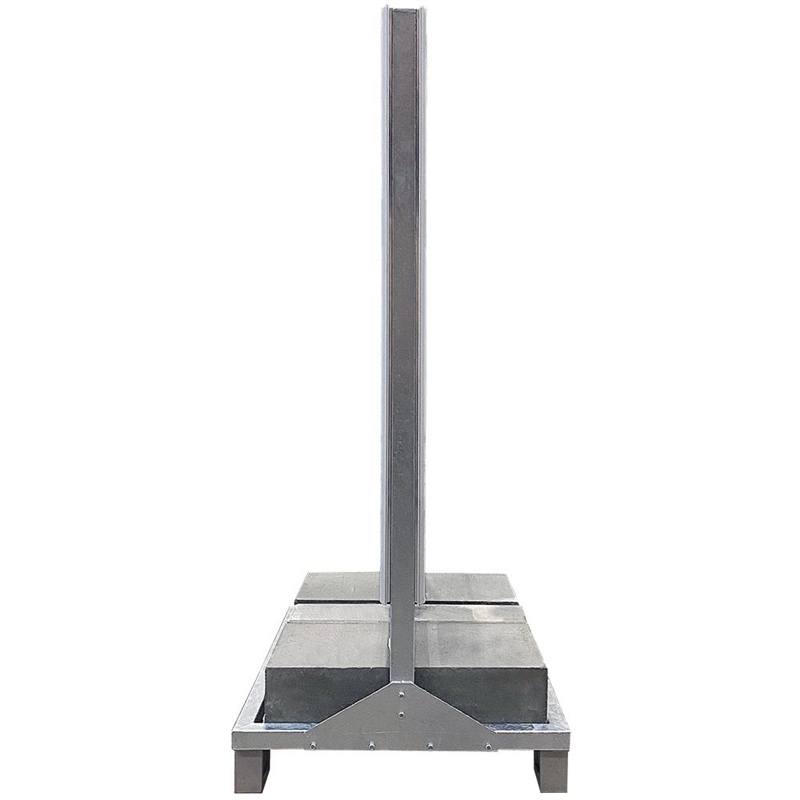 Detta stormfasta skylt är konstruerat i robust rostfritt stål, med en silvergalvaniserad yta och en fot bildad av betongmoduler.