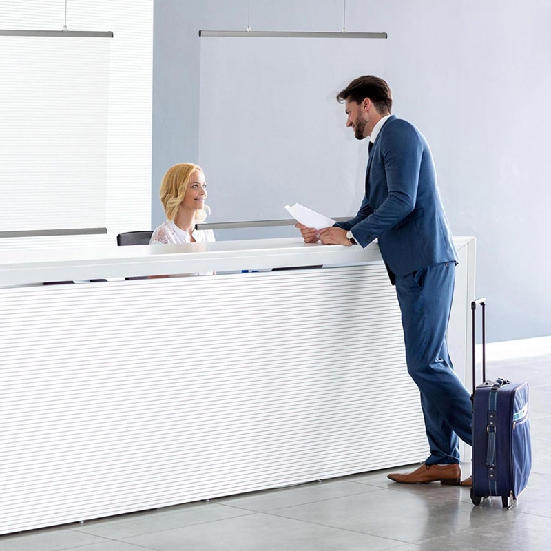• Takmonterad hygienisk skärm: Perfekt som skydd mot luftburna bakterier i receptioner, kontor och affärer.