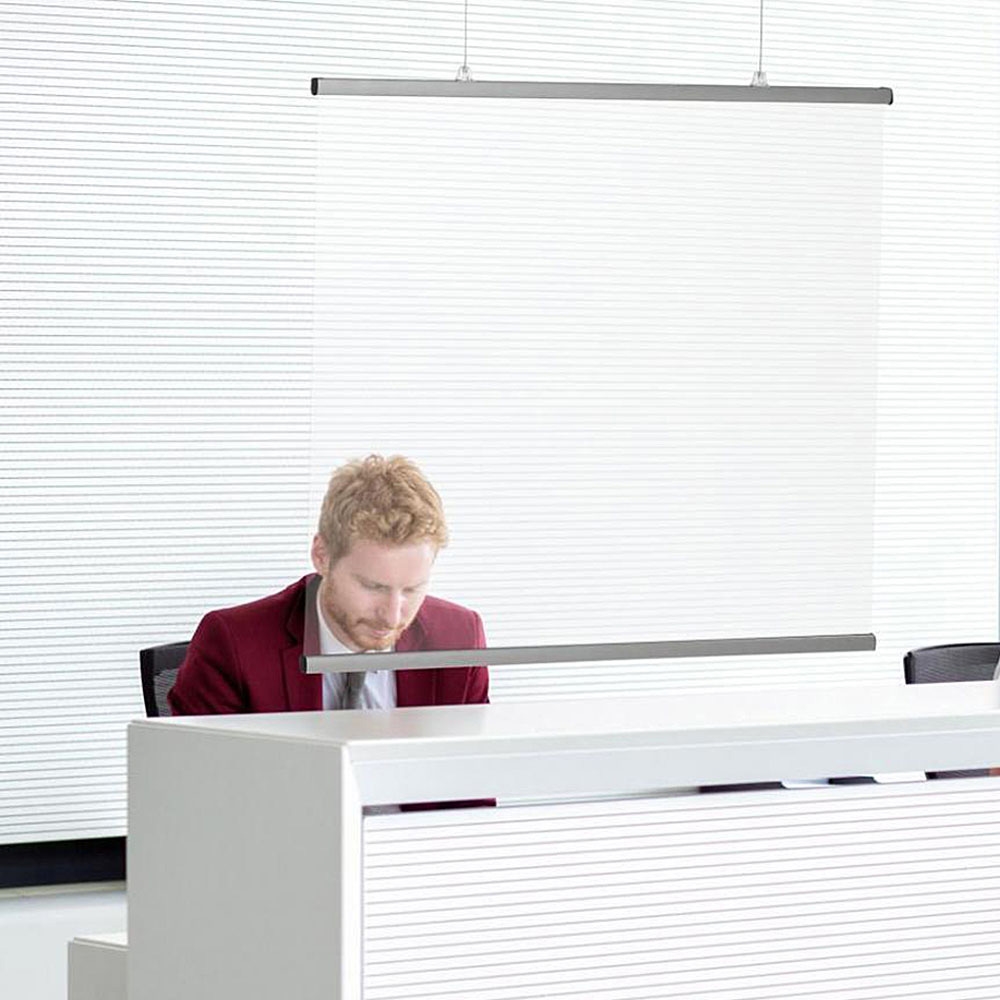 Denna takhängda hygieniskärm är den idealiska lösningen för att öka skyddet mot luftburna bakterier och virus i receptionsområden, kontor och butiker.