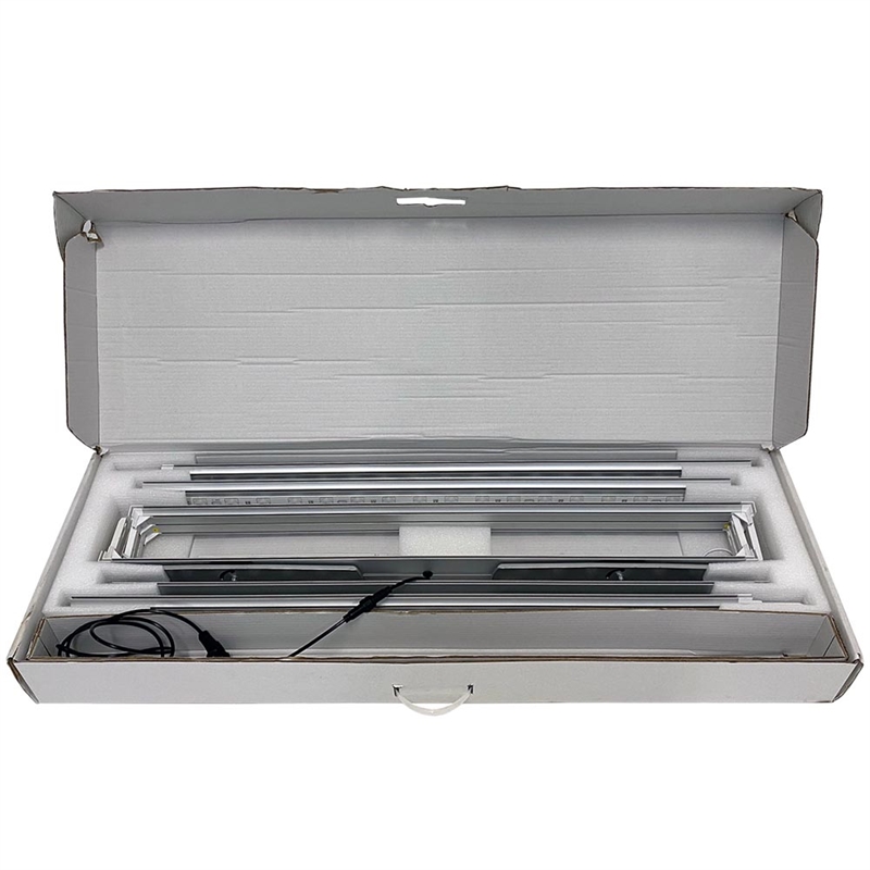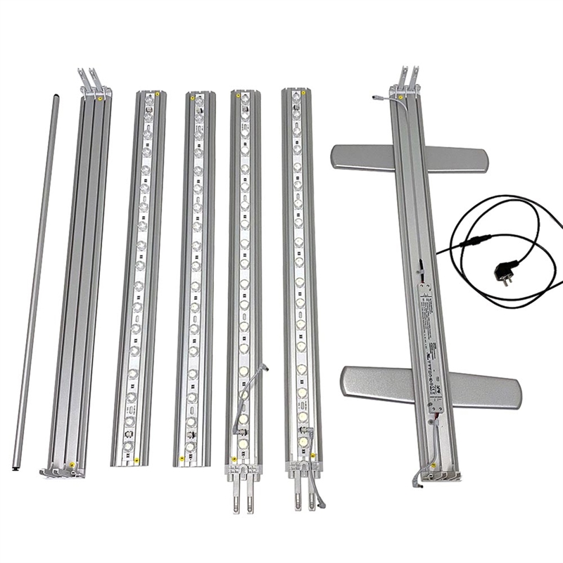 med två fötter och kraftfulla LED dioder längs båda sidor, som ger ett superstarkt och jämnt fördelat ljus på budskapet. Perfekt för mässor, i butiker, fönster, utställningar, showroom etc. Levereras separat i kartong med handtag. Snabb att montera och sätta upp utan verktyg. Inkl. 2 meter kabel. Bannern är tryckt på textil - på vilken en gummiremsa sys fast (ingår ej).