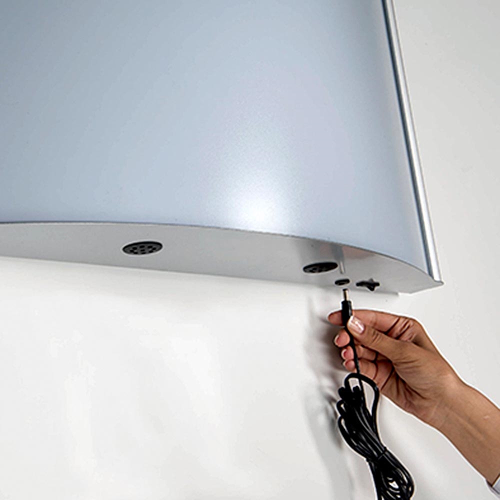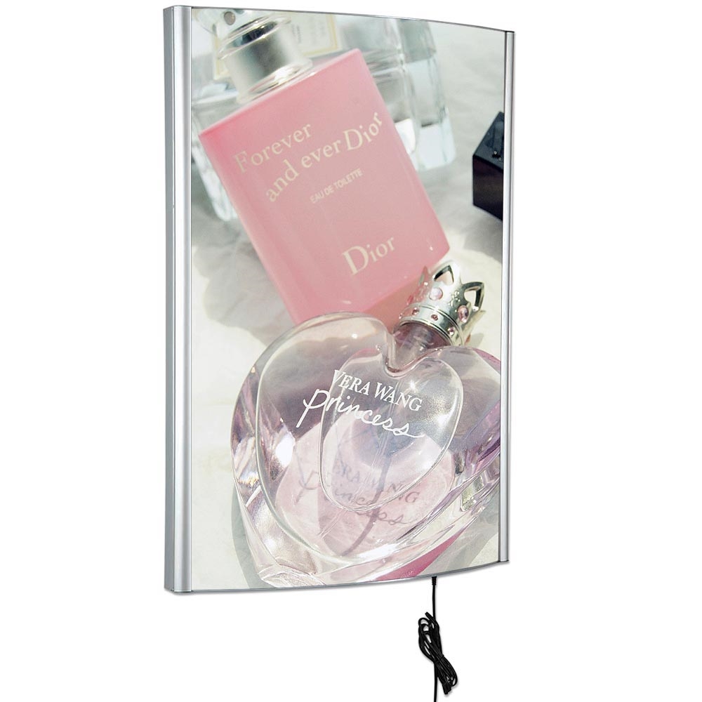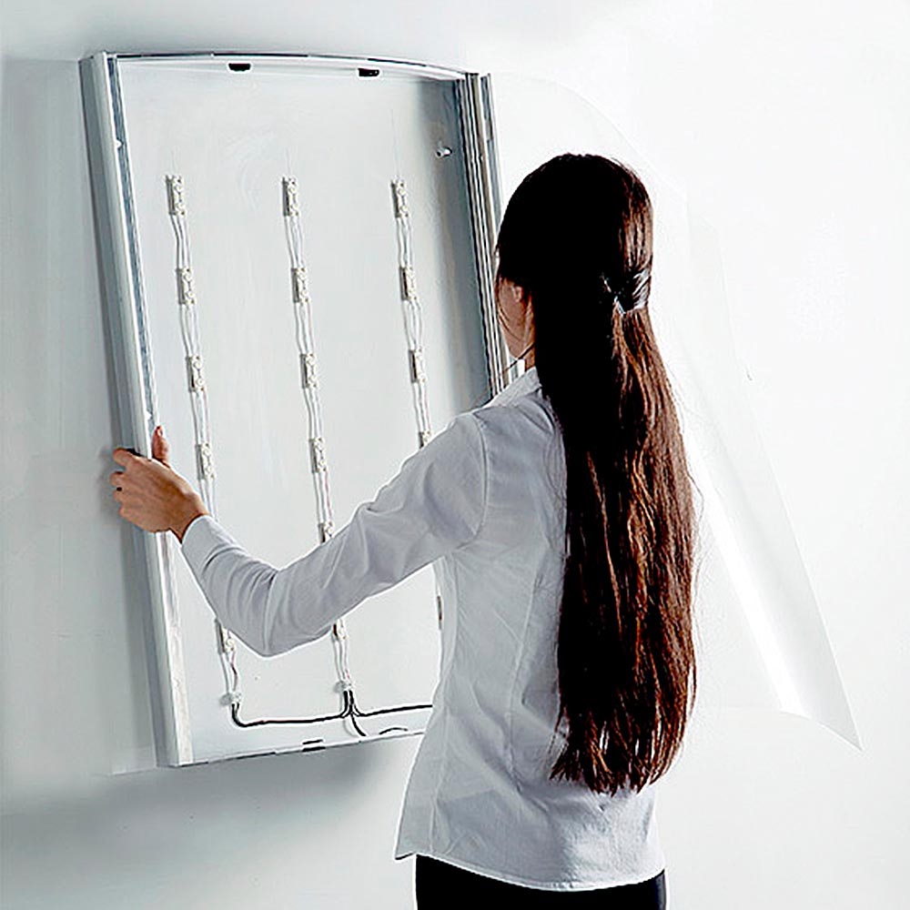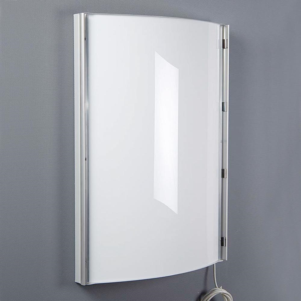 Enkelsidig LED ljuslåda med 25 mm klaffprofiler i aluminium på ljuslådans två långsidor vilket gör det enkelt att byta affischen. Convex Lightbox levereras med APET antireflekterande frontplattor - bakplatta i 3 mm opalvit akryl och 2,5 meter kabel. För inomhusbruk.