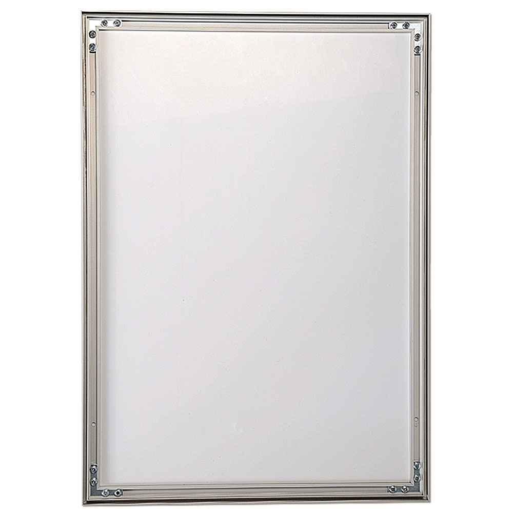 Enkelsidig ram med anodiserad aluminiumprofil - 15 mm djup - för väggmontage. Banderollen sys fast på en nylonremsa och monteras i ramen. Levereras omonterad (utan nylonremsor och banderoll). Rekommenderas för inomhusbruk.