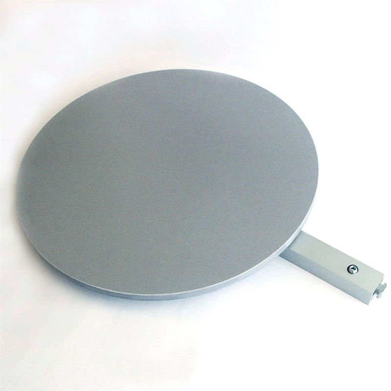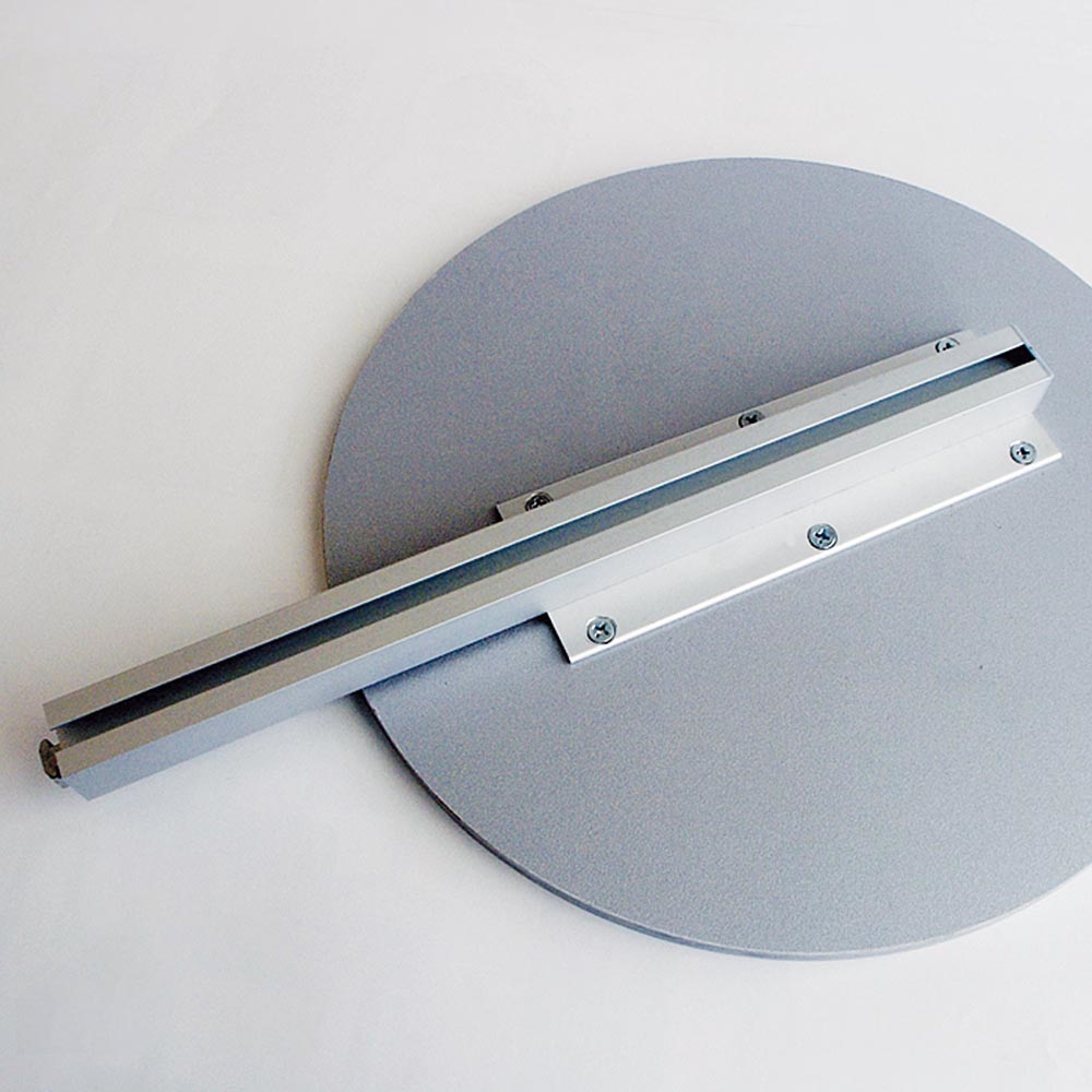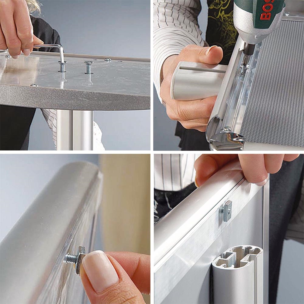 Infoställ med 25 mm vikram i aluminium för A4- eller A3-affisch och rund MDF-hylla Ø 25 cm för t.ex. handsprit. För inomhusbruk.