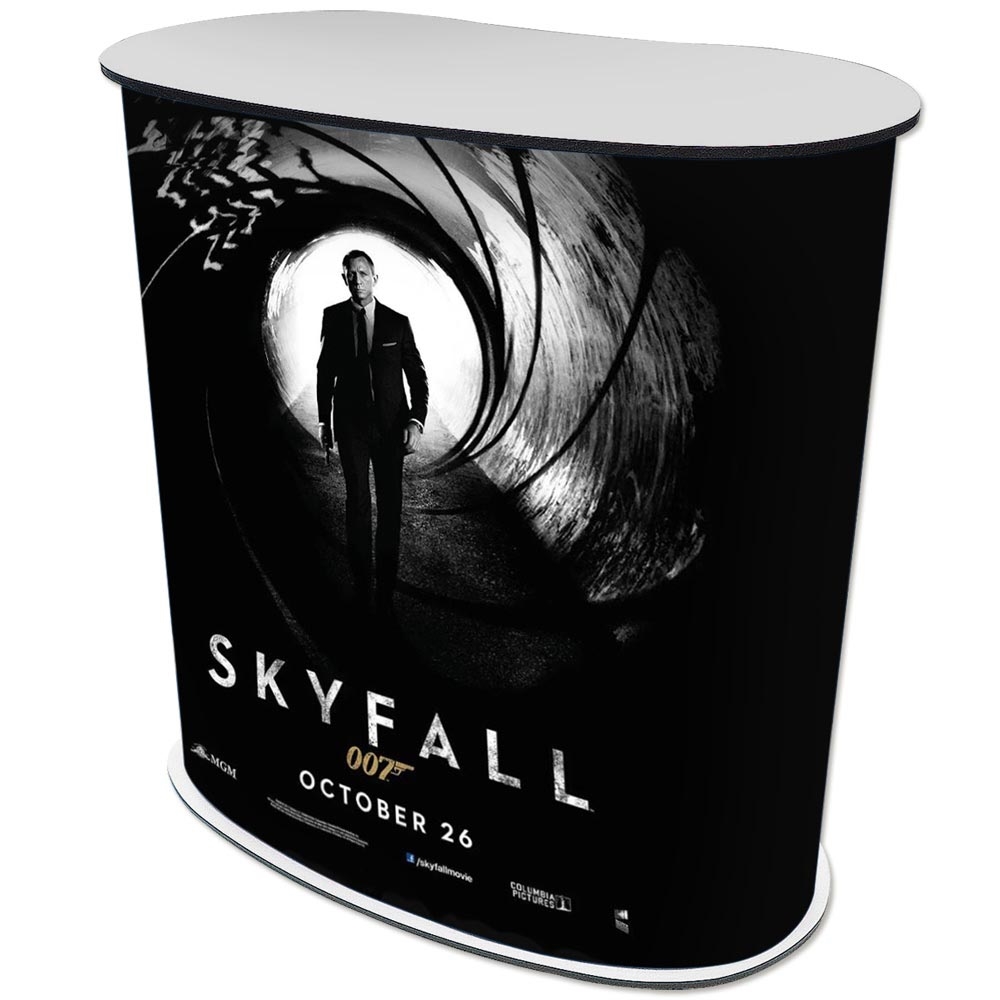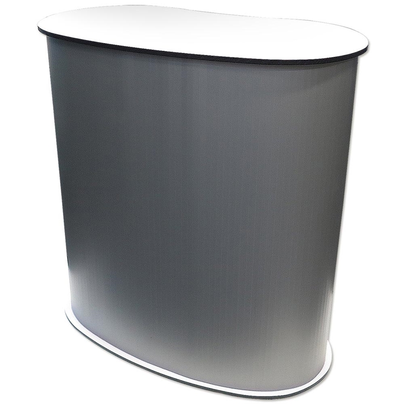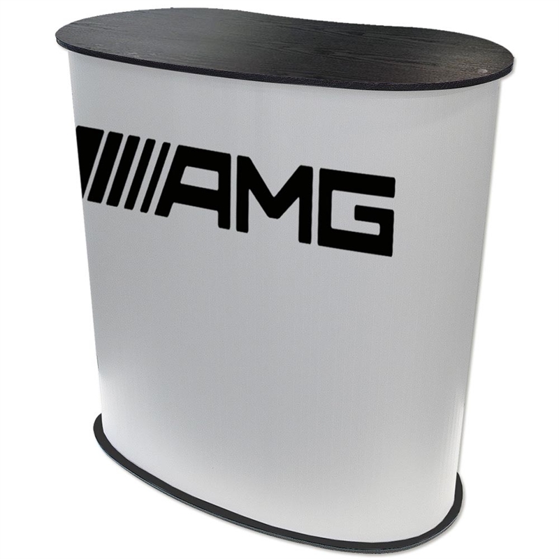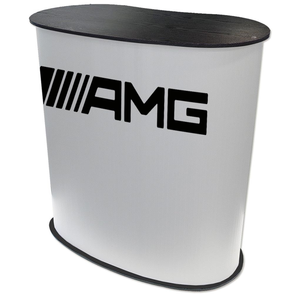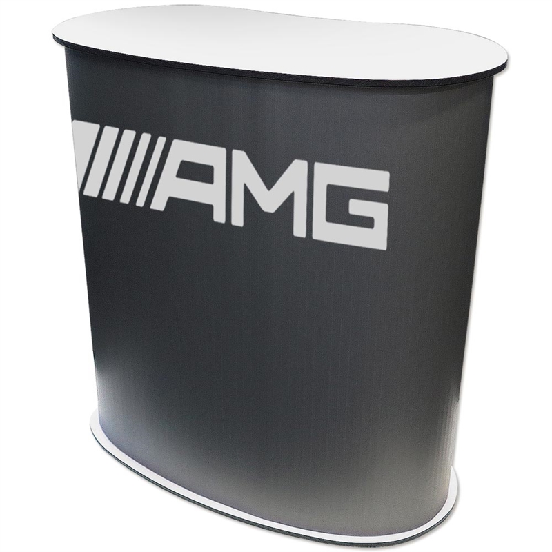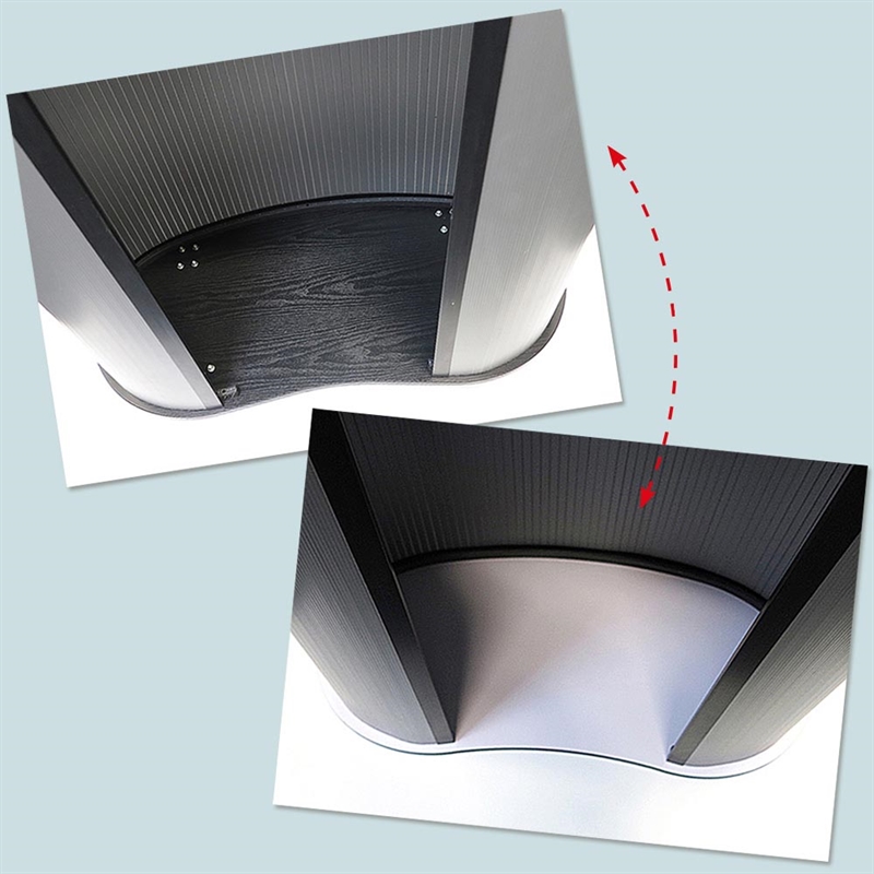 Topp- och bottenplåtarna är svarta på ena sidan och vita på den andra. Genom att vända på produkten kan du välja om du vill visa den med en svart eller vit bordsskiva (panelen med trycket behöver bara vändas). Praktisk och enkel att sätta upp och transportera. Inkl. en hylla och två påsar.