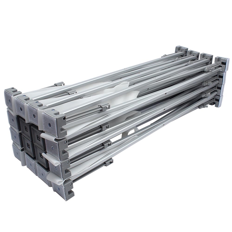 • Produkten är lätt att montera och fälla ihop. Den levereras i en trolley för enkel transport och kan monteras med en tryckt tygbanner (ej inkluderad) fäst vid ramen med kardborreband.
