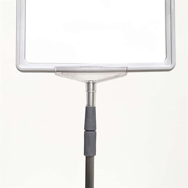 Det här prisramset inkluderar en aluminiumfot och stång och en vit A4-ram som mäter 21 x 29,7 cm. Höjden kan justeras mellan 72 och 90 cm, bredden är 21,8 cm, och foten mäter 16 x 21 cm. Setet väger 0,6 kg.