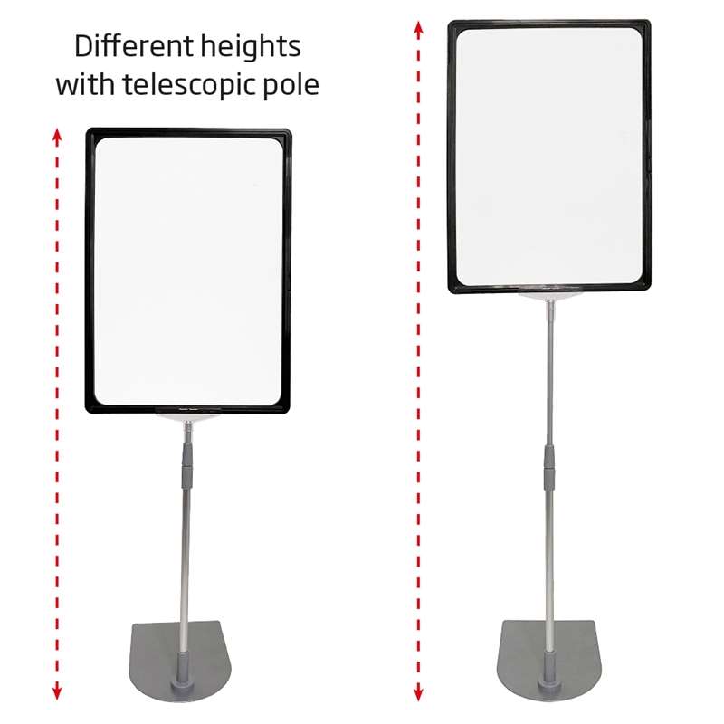 • Prisramssats inkluderar en aluminiumfot och stav samt en svart A5-ram: Perfekt för att presentera information i detaljhandeln, restauranger eller kontor.