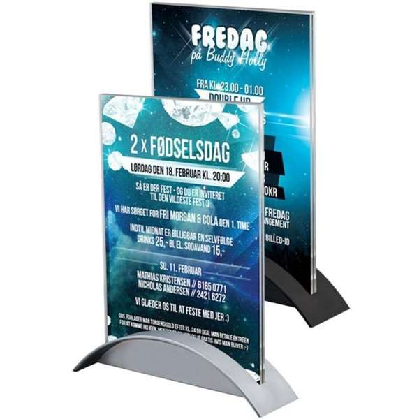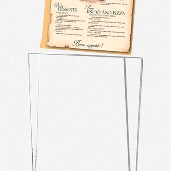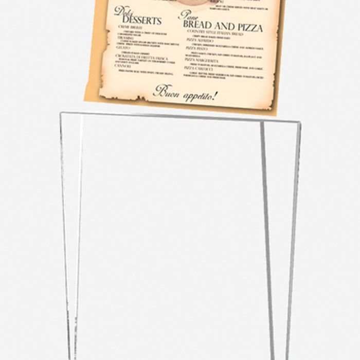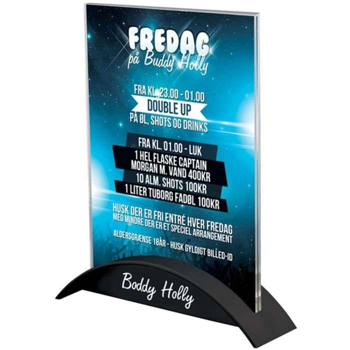 Menukortholder är en elegant och funktionell lösning för att presentera dina menyer. Denna produkt är en 2-delad menyhållare med en topp tillverkad av transparent akryl, vilket visar dina menyer tydligt och tydligt. Menyhållaren har en snyggt designad plastfot med en 7 mm skåra för toppen som säkerställer en stabil och säker placering av dina menyer.