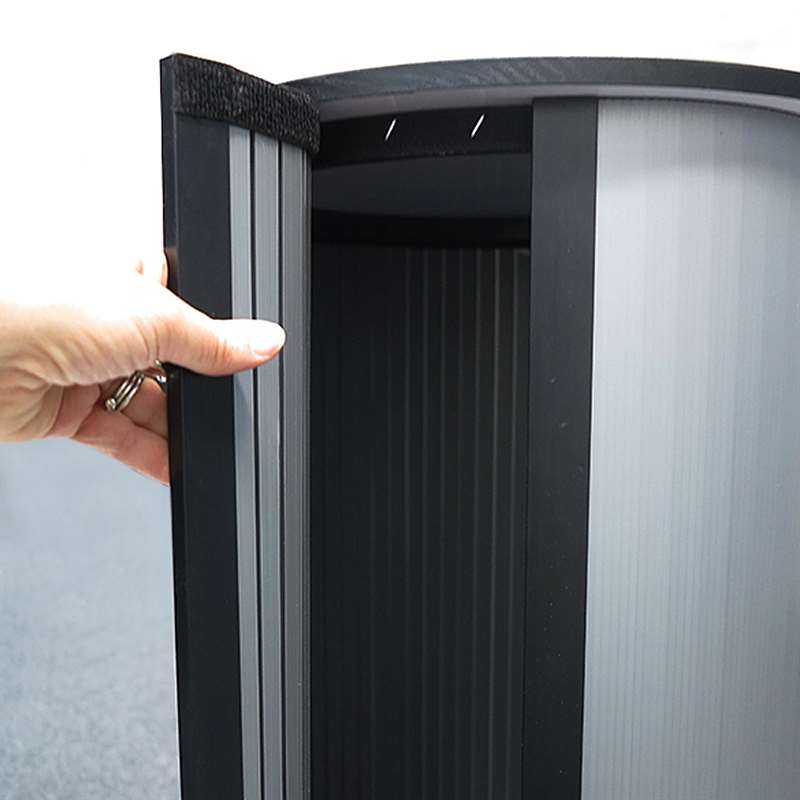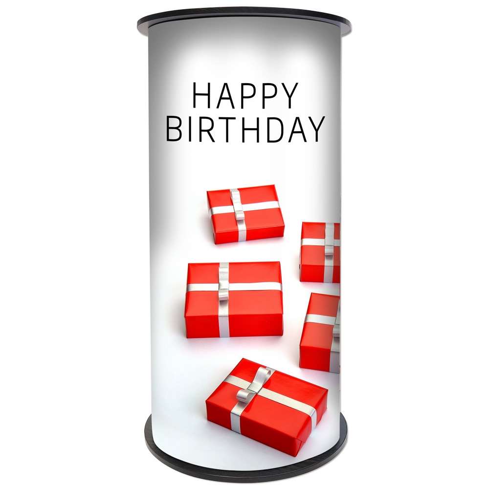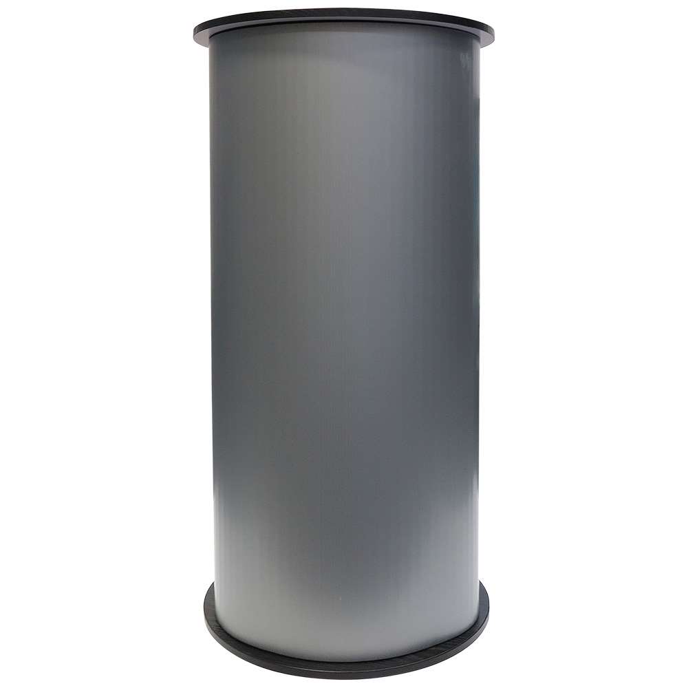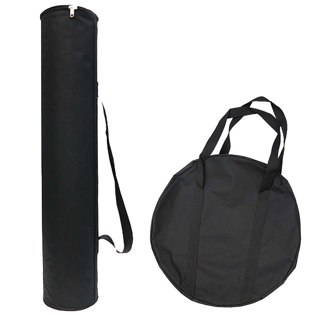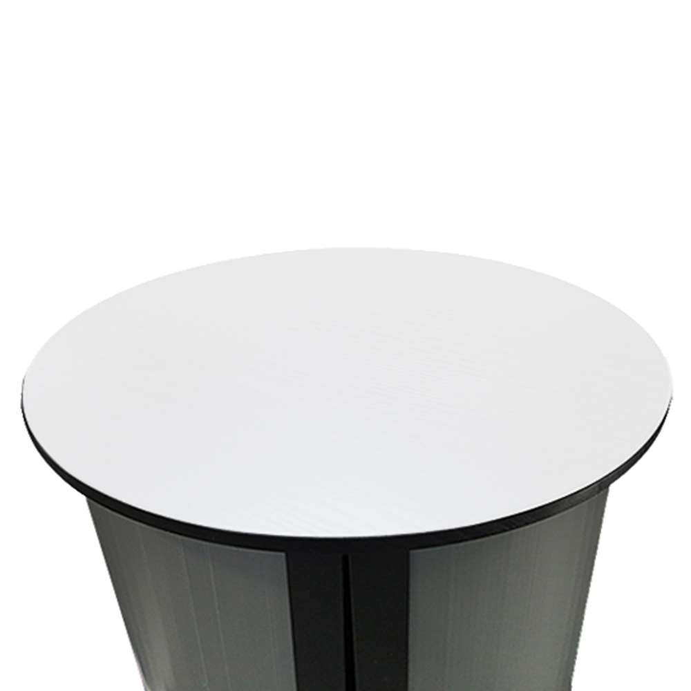 Rund mässdisk i högkvalitativ plast. Topp- och bottenplatta i svart/vit - kan vändas efter önskemål. Inkl. plastpanel för folietryck - och två svarta påsar. Lätt att sätta upp och transportera.