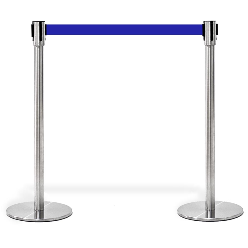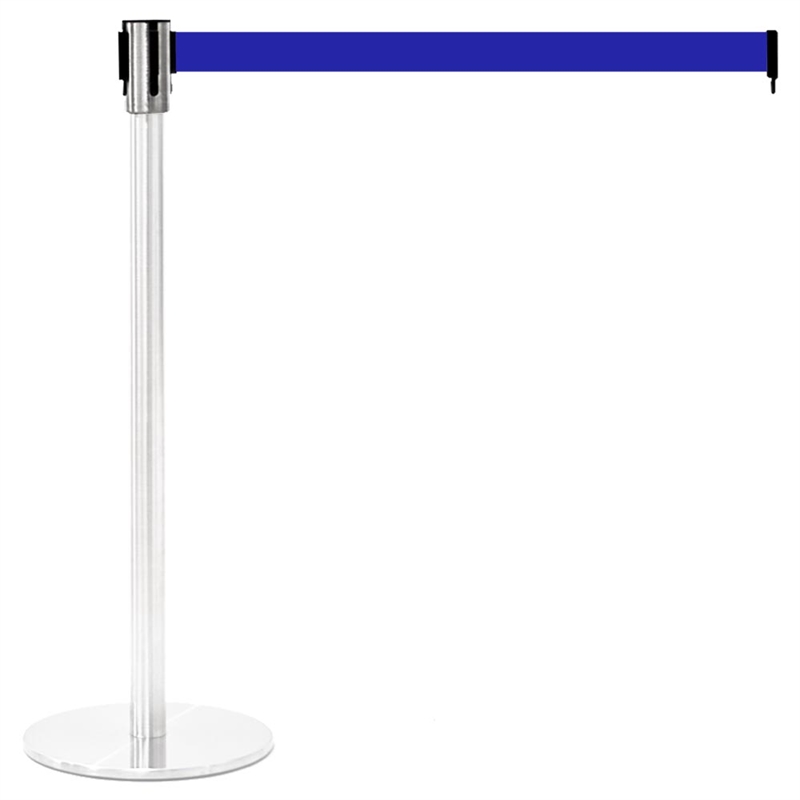 Detta produkt är en avspärrningsstolpe med bältesdispenser på toppen. Den kommer i en stark blå färg, perfekt för att markera avgränsade områden.