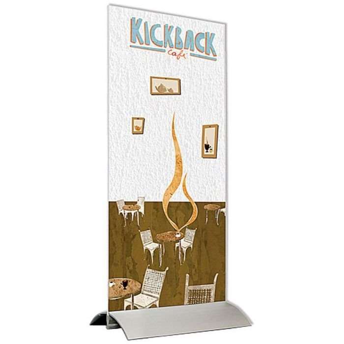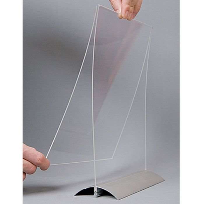 Menyhållare tillverkad i transparent akryl och aluminiumbas med kraftig fjäderstängning. Vertikalt fristående.