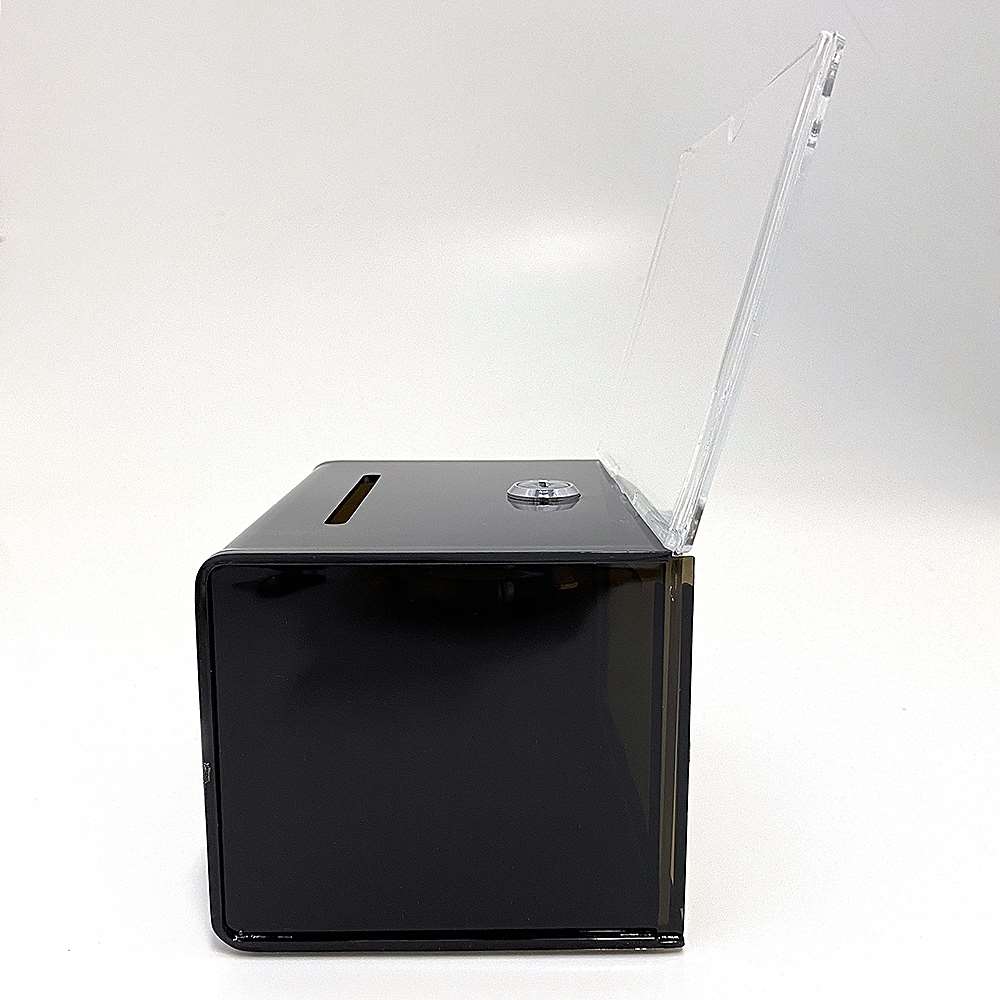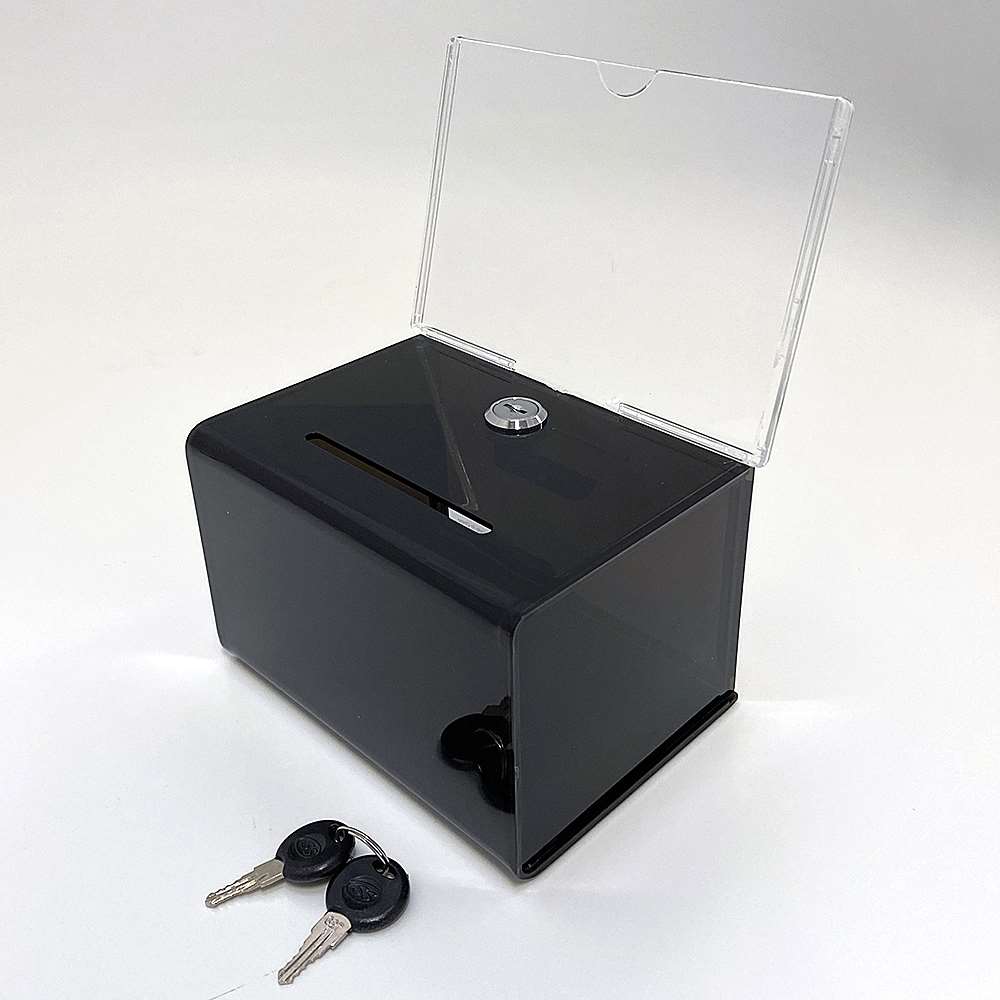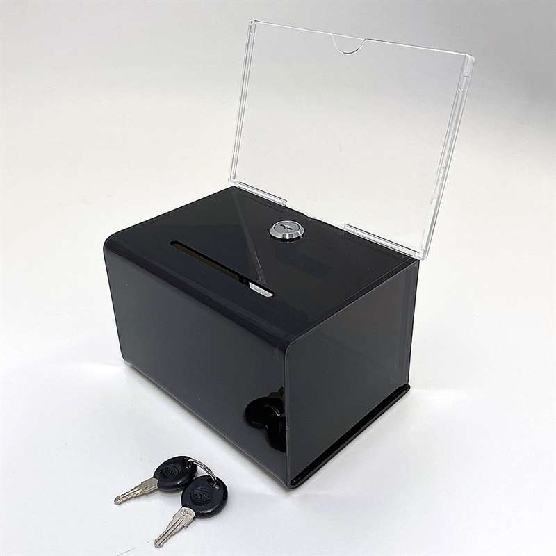 Svart akryllåda med spricka i toppen för t.ex. tips, valsedlar, ris- och lovsedlar, tävlingskuponger, pengar etc. Transparent informationshållare för tryckning. Inkl. två nycklar.