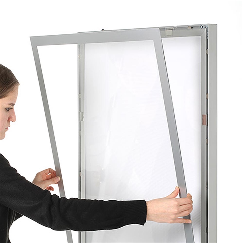 Den är en högkvalitativ, fristående och dubbelsidig LED-ljusställning. Den är tillverkad med en robust 35 mm aluminiumprofil med avrundade hörn för en modern och strömlinjeformad look. Ställningen har en akrylfrontplatta med magnetisk stängning, vilket gör det enkelt att byta budskap eller skyltar efter behov.