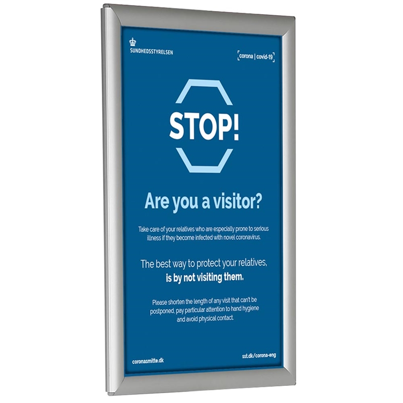 • Väggmonterad hållare inkluderar en 25 mm aluminiumram för A4 eller A3 affischer och en liten hylla med kardborrband för handsprit.
