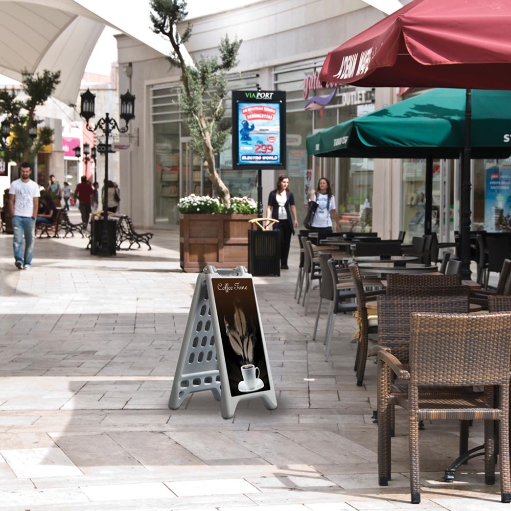 Beställ din Vacu Display Gatupratare A - silver idag och gör din skylt till det centrala fokuset för fotgängartrafiken!