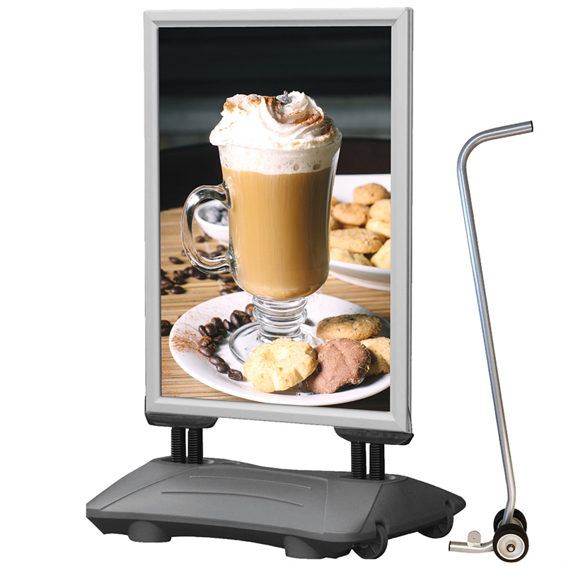 • Det är enkelt att flytta skylten med de 2 hjulen monterade i fotens botten. För en lätt och bekväm flytt rekommenderas dock att köpa till en flyttverktyg.