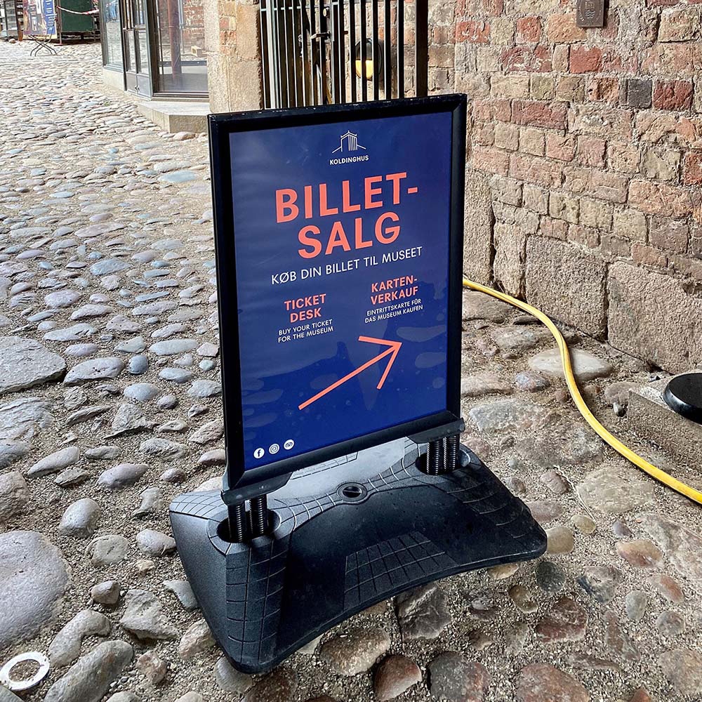 • Skyltens fot är gjord av stöttålig plast som kan fyllas med vatten eller sand. Om man väljer att fylla den med vatten rekommenderas det att tillsätta frostskyddsmedel under perioder med frost för att förhindra skador på materialet.