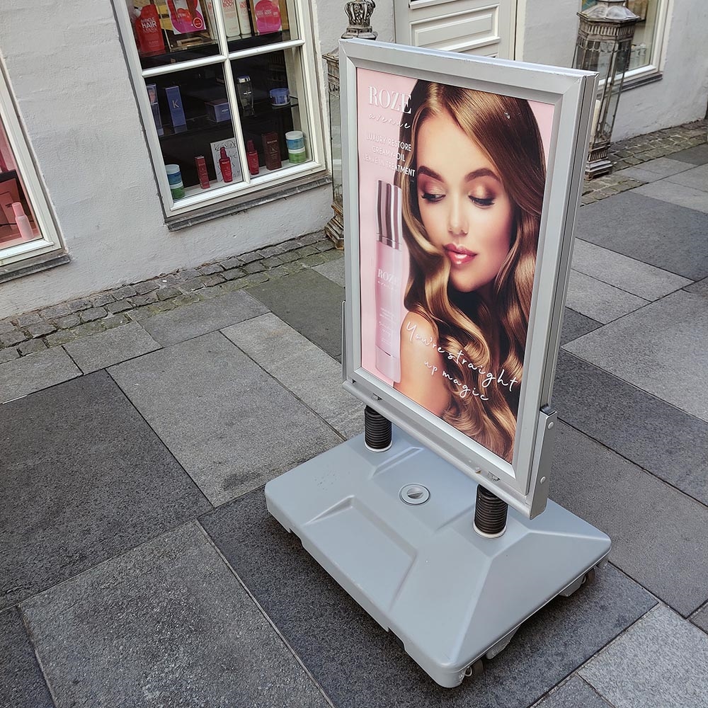 • Skiltets totalmål er 82 x 122 x 65 cm og det har plads til en plakat i A1 format (59,4 x 84,1 cm). En passende plakat kan tilkøbes og vil blive fremstillet på Väderbeständig PET Stayflat film, klar til levering inden for 3-5 hverdage.