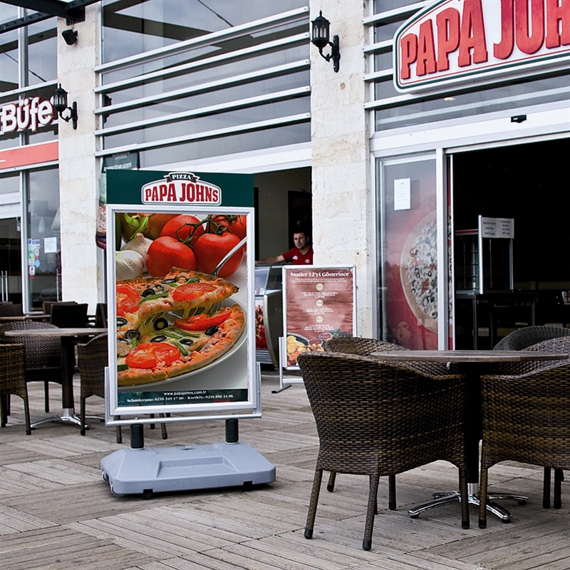 • Wind-Sign Waterbase Gatuskylt är designat för att stå stadigt även i stark vind, tack vare sin stabila fot. Fällramen är gjord av 45 mm profiler med geringhörn och den tål vatteninträngning genom sin skumlist.