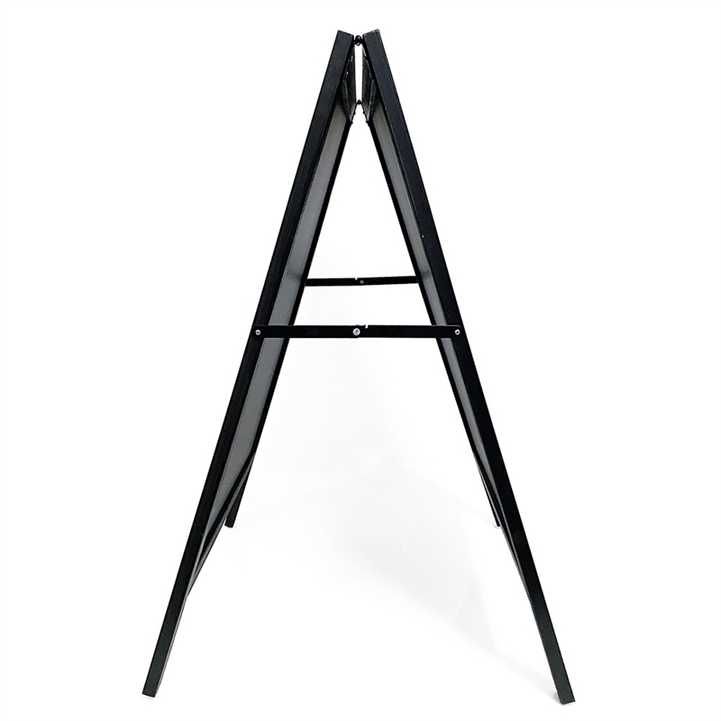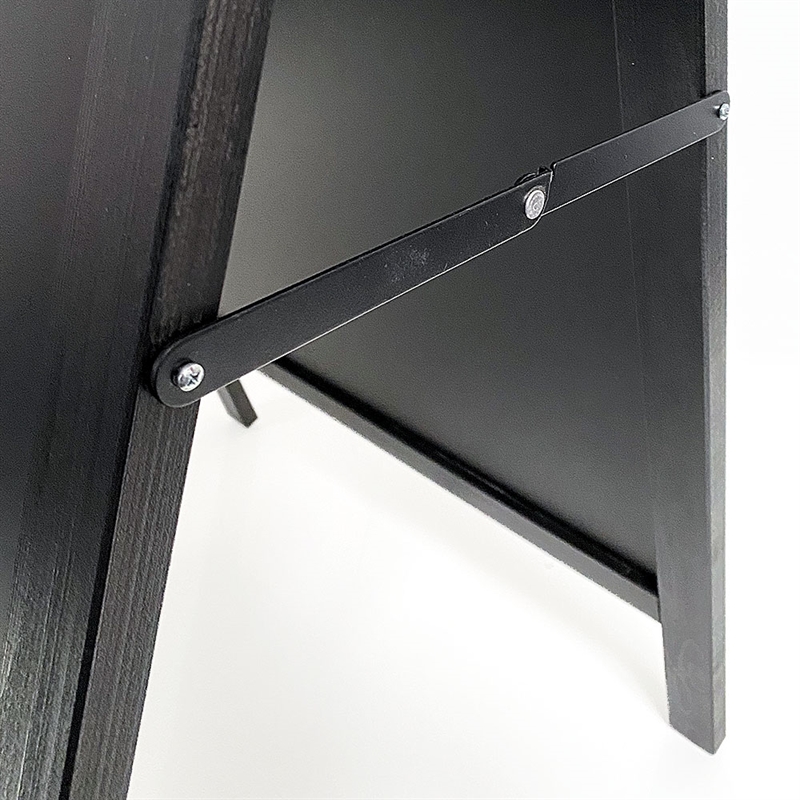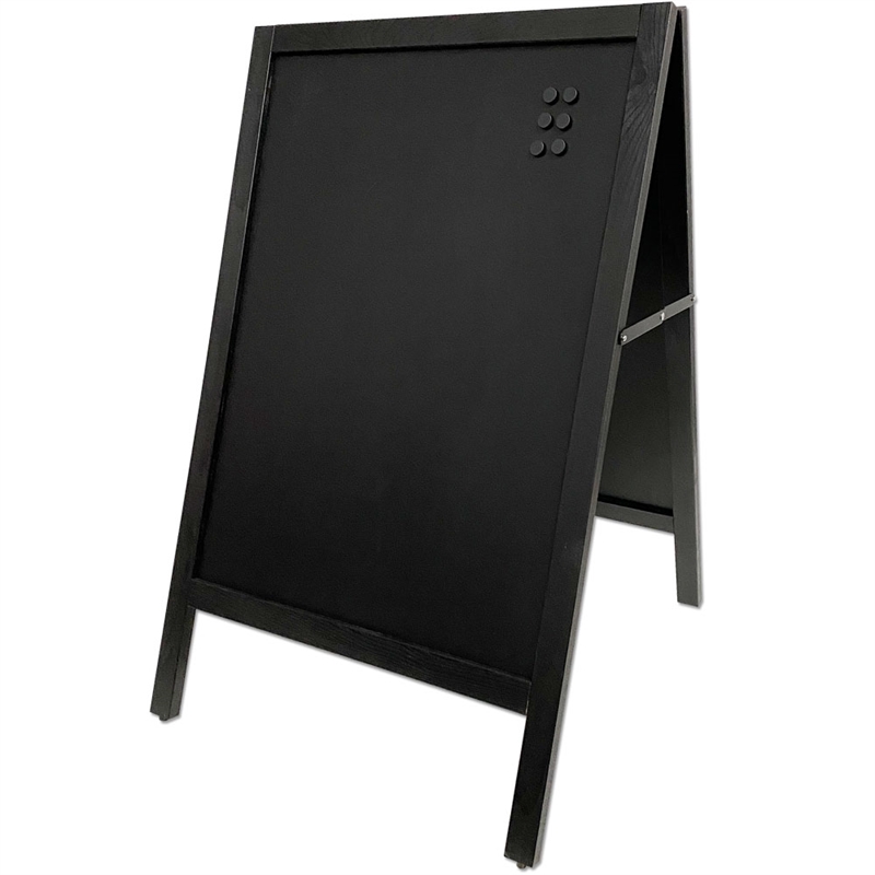 Denna stiliga A-skylt i svartbetsat trä med ståltavlor kommer att tillföra en touch av elegans och funktionalitet till din butik eller restaurang.