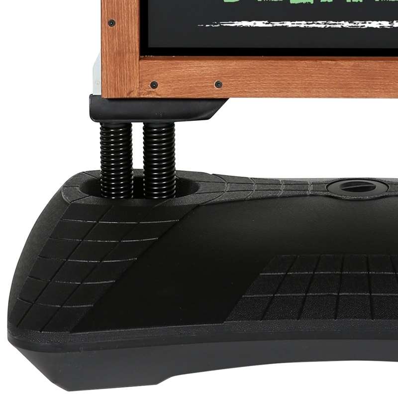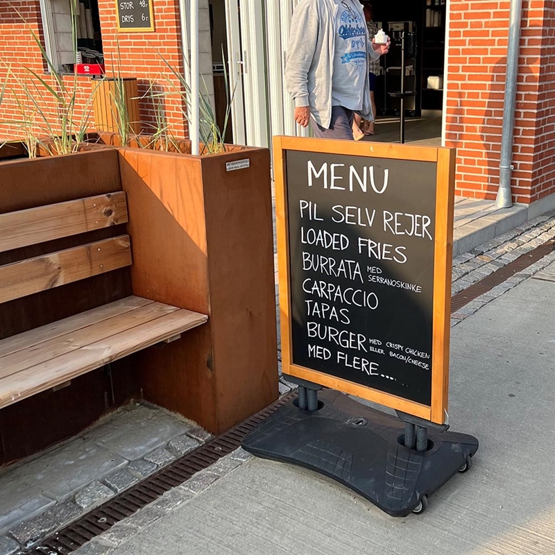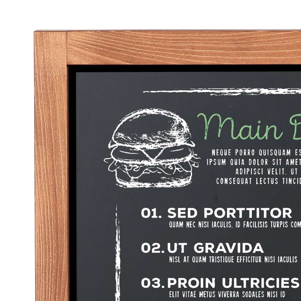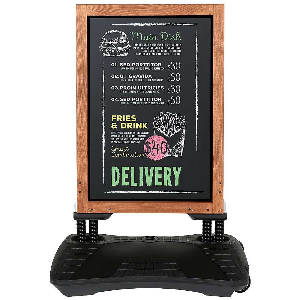 Skylten är en stabil och snygg skylt som utstrålar enastående estetik med svarta ståltavlor inramade i en fin mörkbetsad träram. Den erbjuder en fantastisk möjlighet att locka kunder till din affär genom unika och kreativa annonser med individuella teckningar och erbjudanden.